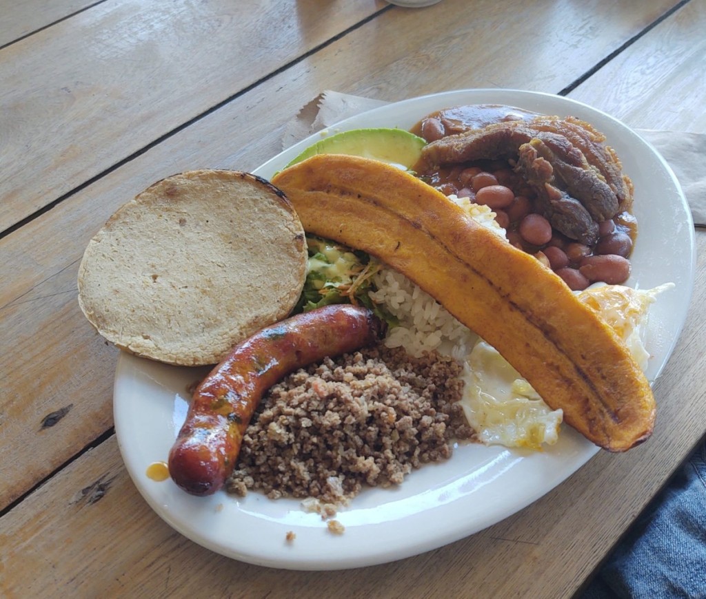Bandeja Paisa: The region’s signature dish — a hearty platter of rice, beans, chicharrón (crispy pork), fried egg, plantain, arepa, and avocado.